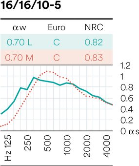 Developed and successfully used by Topakustik, the T-Perforation has a discreet effect while still offering high-performance absorption. Topakustik Perfo T is available with perforation bores of 3, 4 and 5 mm. The smaller the visible perforations, the more the maximum absorption shifts to the lower frequency.